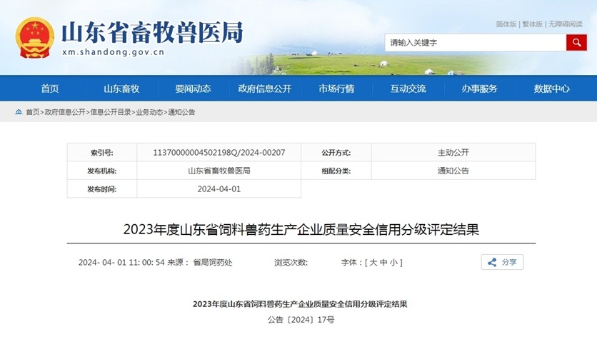 近日,山東省畜牧獸醫(yī)局發(fā)布公告,公布了2023年度飼料獸藥生產(chǎn)企業(yè)質(zhì)量安全信用分級評定結(jié)…